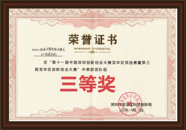 2019年8月,公司項(xiàng)目“邊緣計(jì)算多模式3D視覺(jué)系統(tǒng)”在第十一屆中國(guó)深圳創(chuàng)新創(chuàng)業(yè)大賽龍華區(qū)預(yù)選賽第三屆龍華區(qū)創(chuàng)新創(chuàng)業(yè)大賽的數(shù)百只參賽隊(duì)伍中脫穎而出,榮獲團(tuán)隊(duì)組三等獎(jiǎng)。